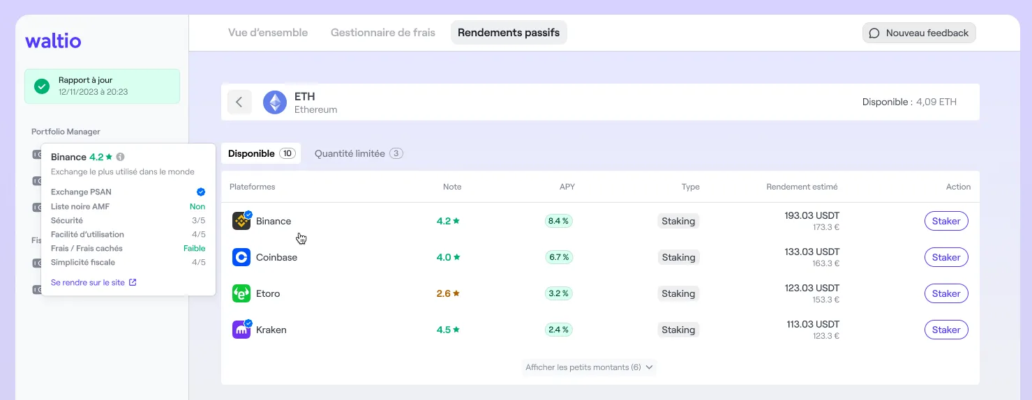 Enfin, Waltio vous aide également à maximiser vos revenus passifs via le staking et à faire croître votre portefeuille crypto. Pour cela, la plateform permet de :