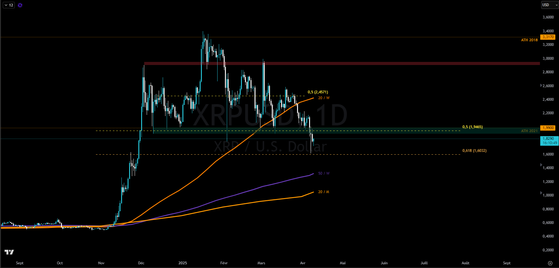 Notre dernière analyse technique du XRP remonte au 2 avril 2025, à un moment où l’actif évoluait autour de 2,10 dollars. Depuis, la guerre commerciale déclenchée par D. Trump secoue l’ensemble des marchés, entraînant une baisse généralisée des cryptomonnaies.
